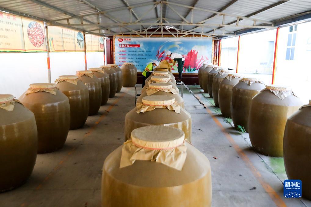 9月6日,在河南省商丘市柘城縣辣椒醬生產企業,工作人員在清理醬缸。
