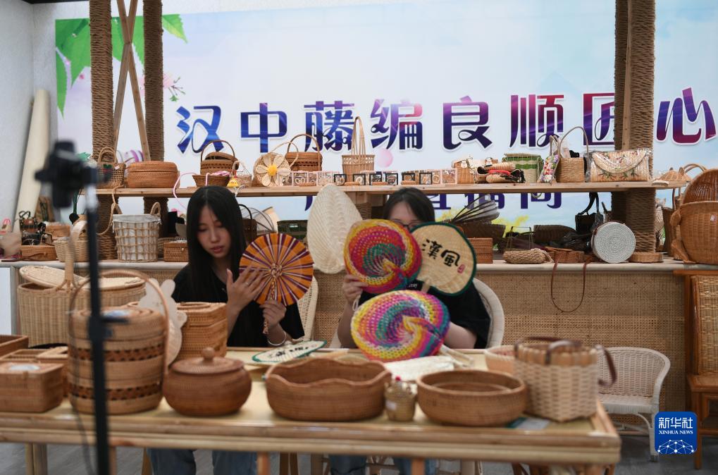 9月7日,在位于漢中市的陜西良順匠心實業有限公司,工作人員在直播推薦藤編工藝品。