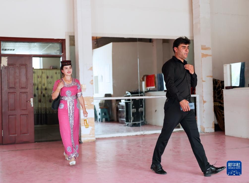完成迎賓演出后,拜合提亞爾·居馬汗和妻子離開游客服務(wù)中心,準(zhǔn)備前往學(xué)校接孩子回家(9月4日攝)。