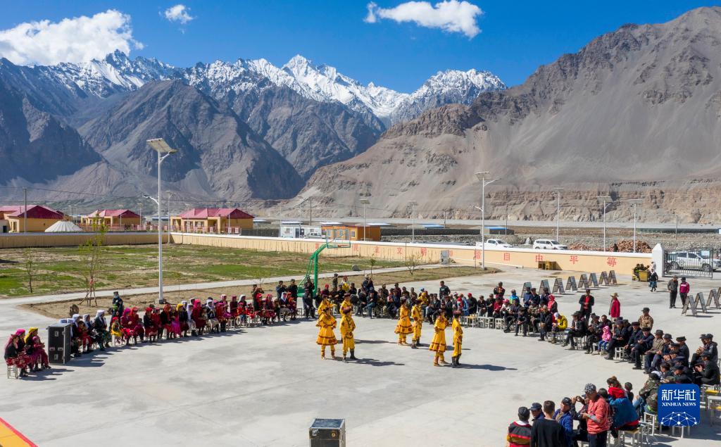 新疆塔縣文工團(tuán)演員古麗巴努爾·庫(kù)爾恰克和同事們?cè)谶_(dá)布達(dá)爾鄉(xiāng)的一處山村為村民表演舞蹈節(jié)目(2020年6月6日攝,無(wú)人機(jī)照片)。