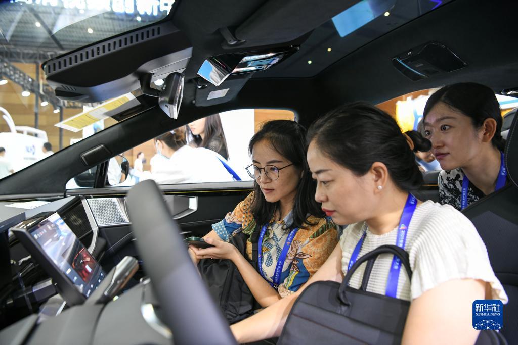 9月7日,在“2023世界顯示產(chǎn)業(yè)大會新型顯示創(chuàng)新成果展”現(xiàn)場,觀眾體驗(yàn)智能座艙。