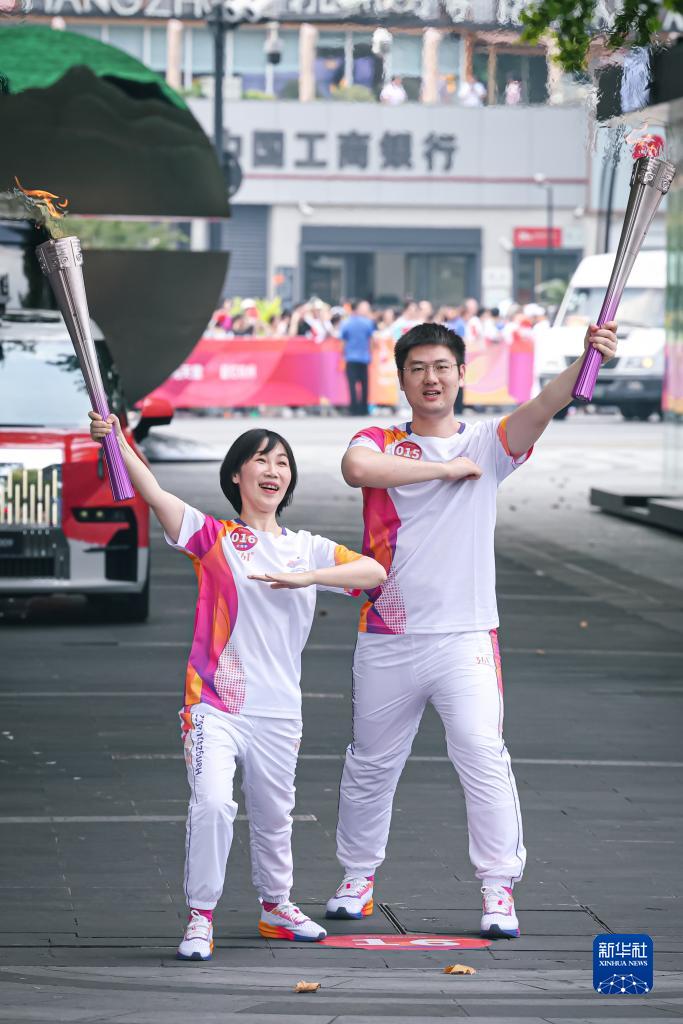 9月8日,火炬手葉雷鵬(右)與婁屹蘭在火炬傳遞中。