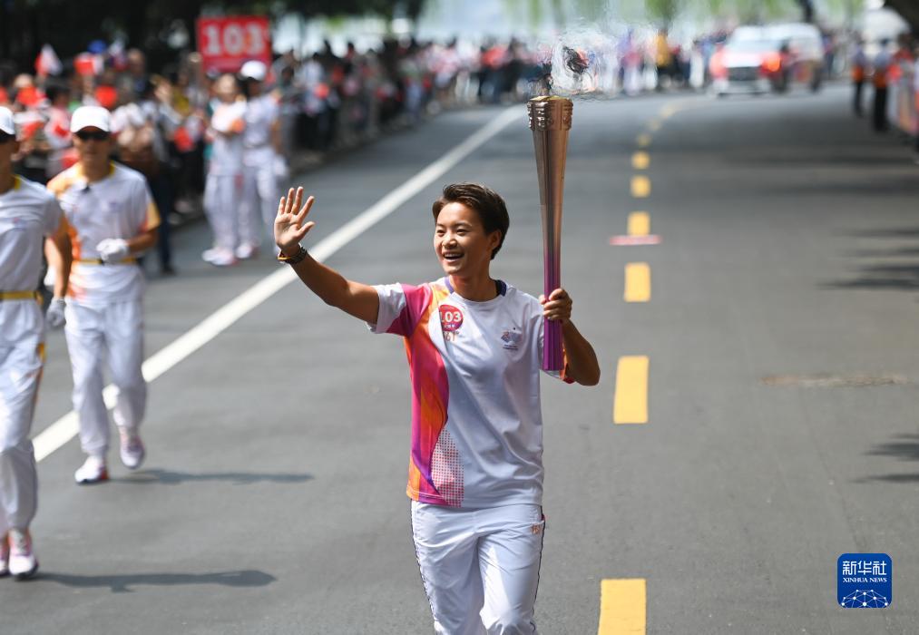 9月8日,火炬手王霜在火炬?zhèn)鬟f中。