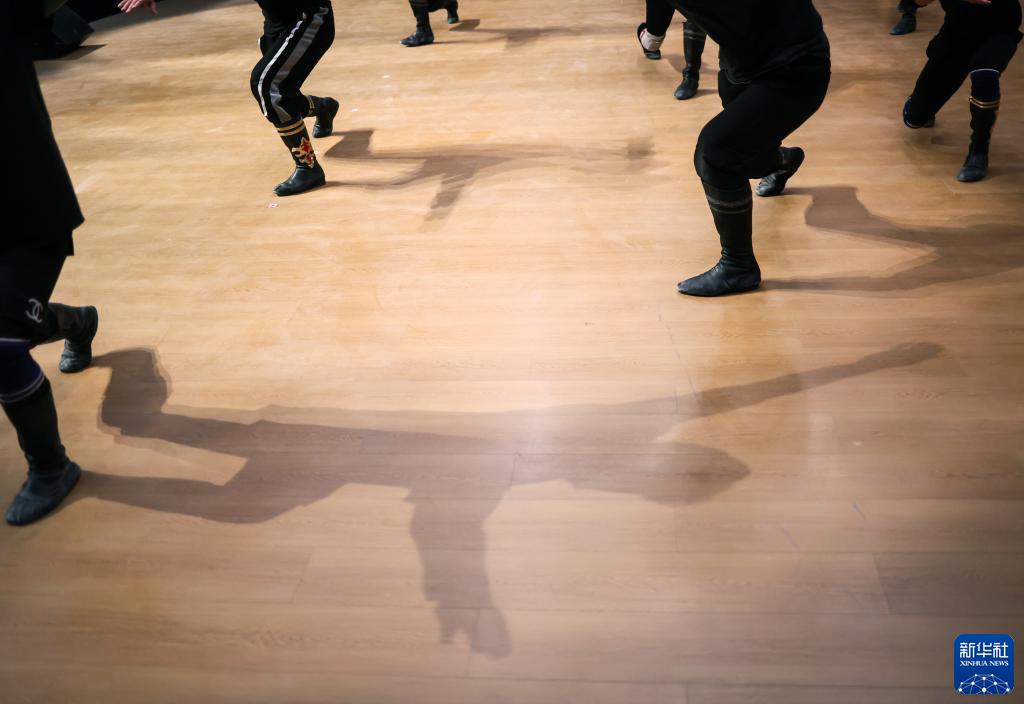 新疆塔縣文工團(tuán)舞蹈演員們?cè)谂啪毼璧腹?jié)目《彈起心愛的庫木孜》(9月4日攝)。新華社記者 蘭紅光 攝