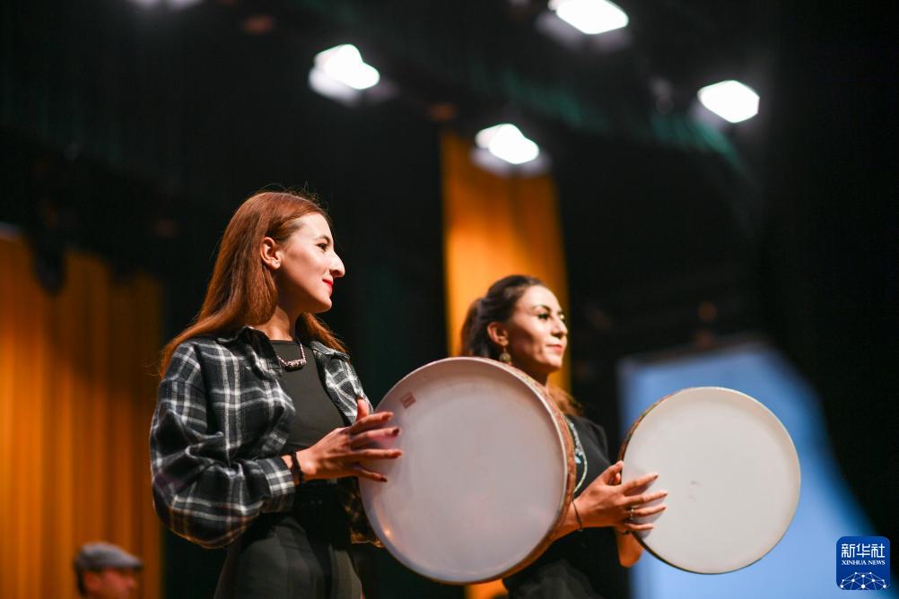 新疆塔縣文工團(tuán)樂手美麗卡·依沙克(左)和同伴在排練時(shí)打手鼓(9月4日攝)。新華社記者 胡虎虎 攝