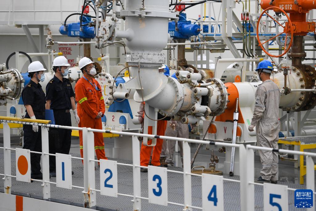 9月7日,廣東大鵬液化天然氣(LNG)接收站工作人員操作卸料臂與“能量自信”號(hào)運(yùn)輸船對接。