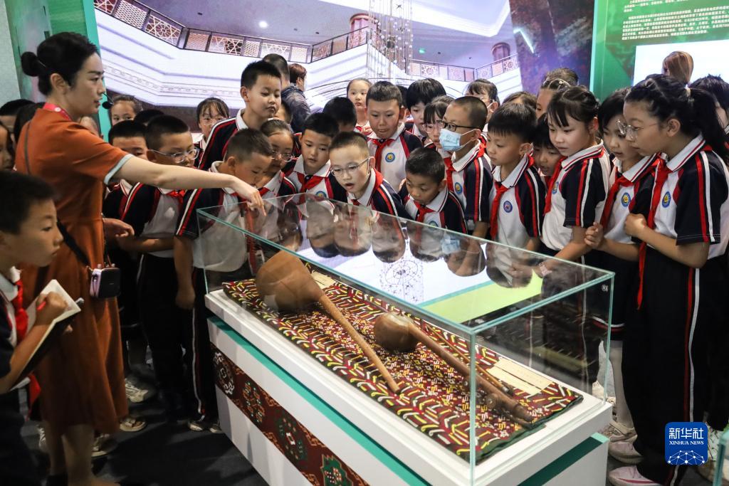 9月7日,學生們在第六屆絲綢之路(敦煌)國際文化博覽會土庫曼斯坦專題展上參觀。