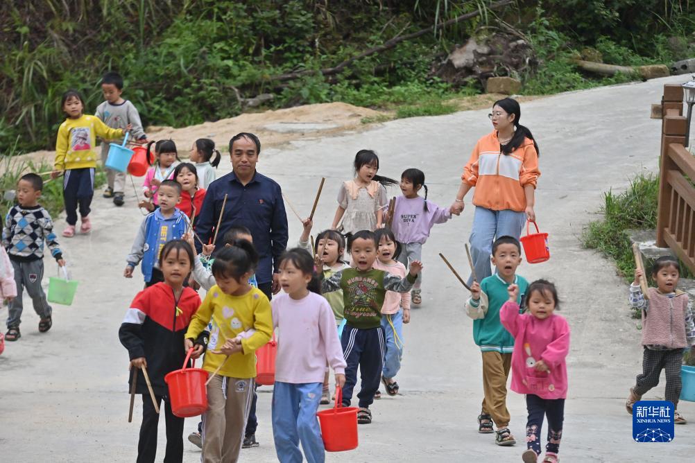 在烏英苗寨,潘先鋒(左)和同事帶著孩子們巡寨搞衛生(2023年9月1日攝)。