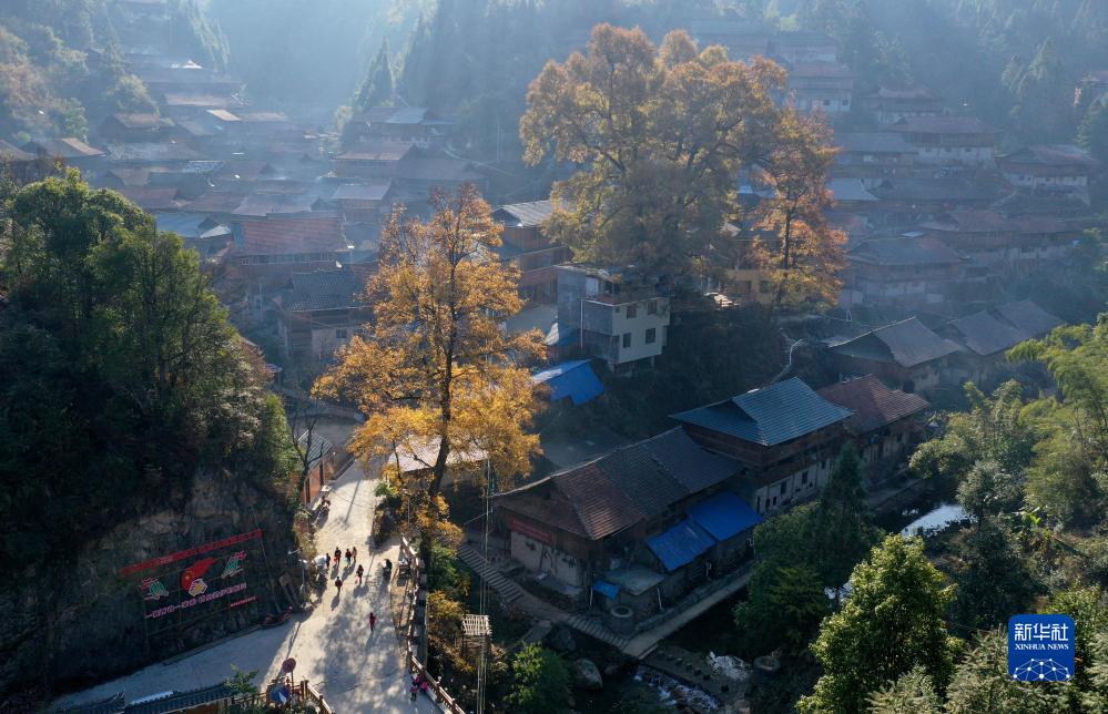 烏英苗寨教學點的孩子們在潘先鋒的帶領下巡寨搞衛(wèi)生(無人機照片,2022年12月21日攝)。