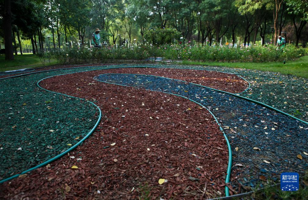 9月7日在德州市行政中心綠地拍攝的用園林綠化垃圾循環(huán)再造的園林景觀。