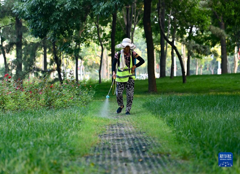 9月7日,在德州市行政中心綠地,綠化養(yǎng)護工人在播撒過草籽的綠道上灑水。