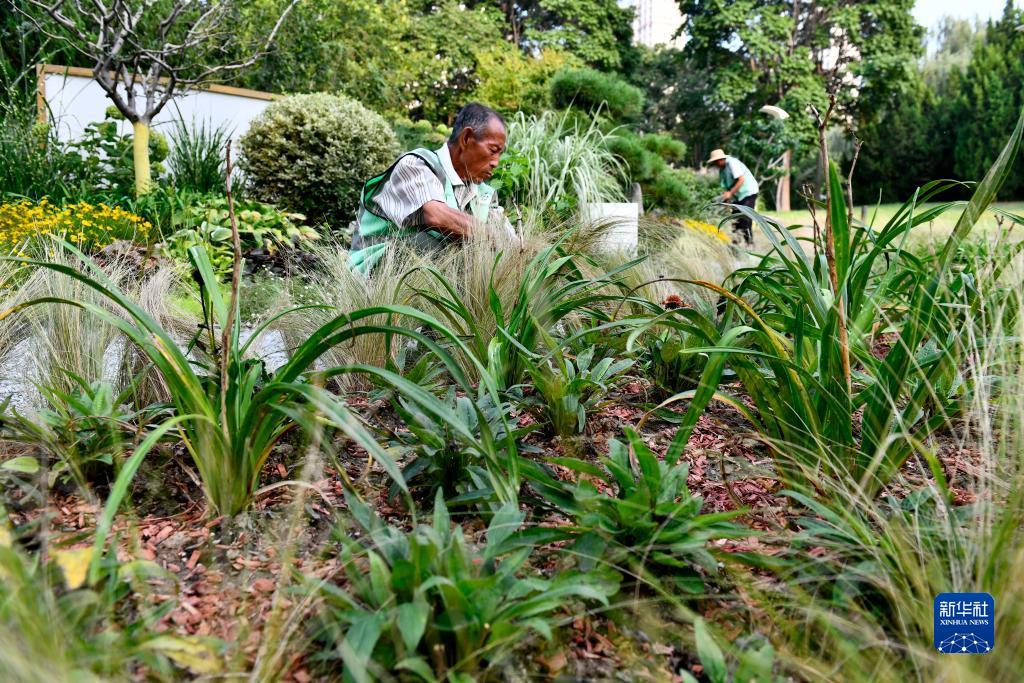9月7日,在德州市行政中心綠地花園,園林工作人員在養護作業。