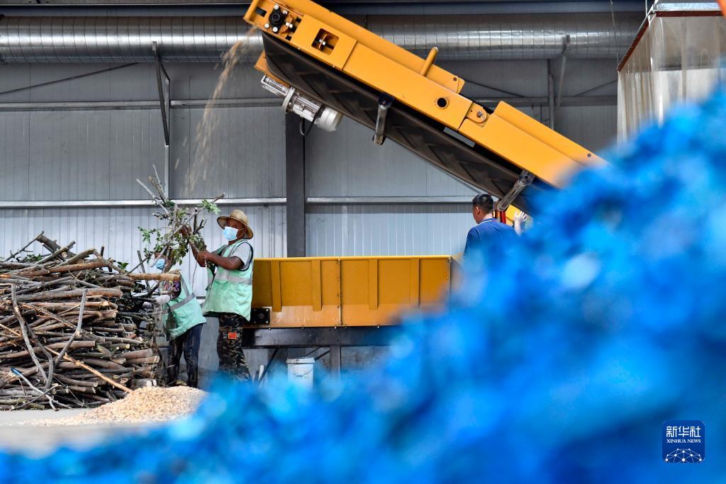 9月7日,在德州市碳循環創新示范基地,工作人員對園林綠化垃圾進行粉碎加工作業。
