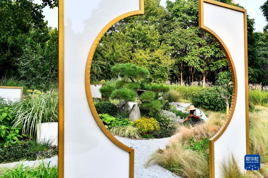 9月7日,在德州市行政中心綠地花園,園林工作人員在養護作業。