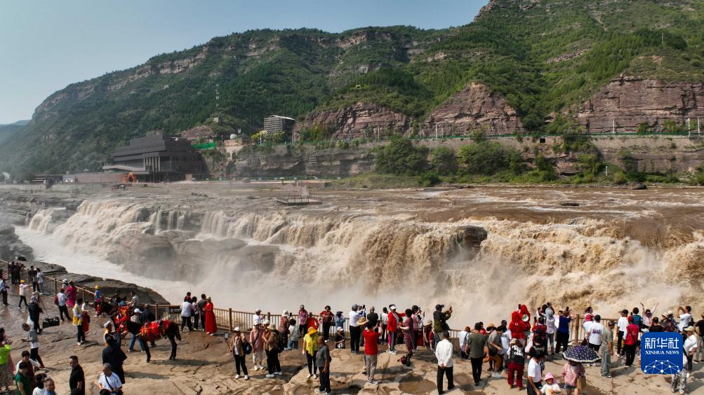 9月8日,游客在黃河壺口瀑布景區游覽(無人機照片)。
