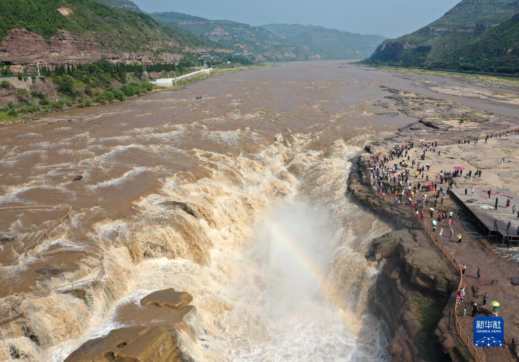 近日,受上游降雨和水庫調節放水影響,黃河壺口瀑布主副瀑布連成一線,滾滾黃河水奔騰而下,吸引游客駐足觀看。