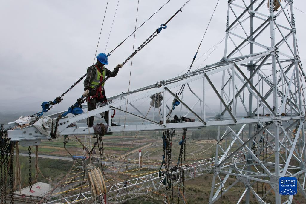 9月8日,工人在武威市天祝縣境內的蘭新(張)三四線甘肅牽引站330千伏外部供電工程施工現場作業(無人機照片)。