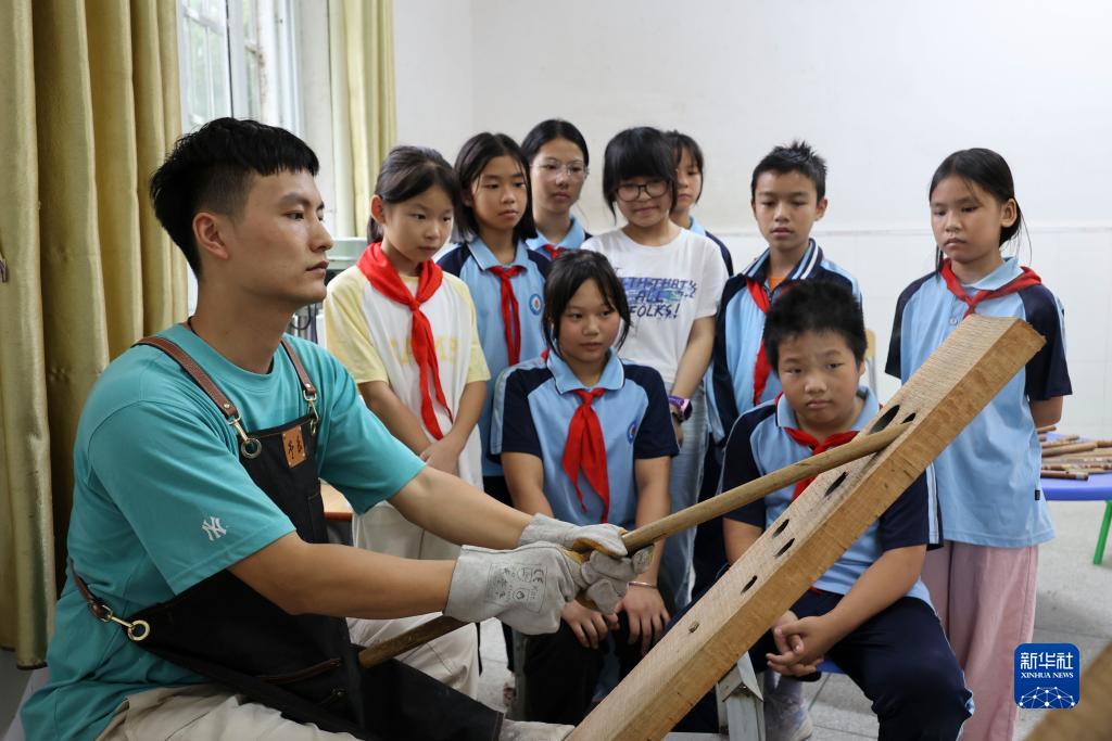 在江西省吉安市泰和縣水槎鄉中心小學,肖惠文教孩子們制作竹笛(9月5日攝)。