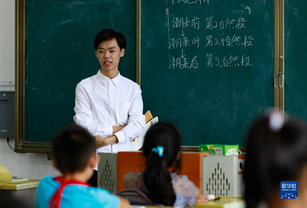 9月7日,在通道縣獨坡鎮上巖村小學,今年剛畢業的“定向師范生”潘遠恒老師在上語文課。