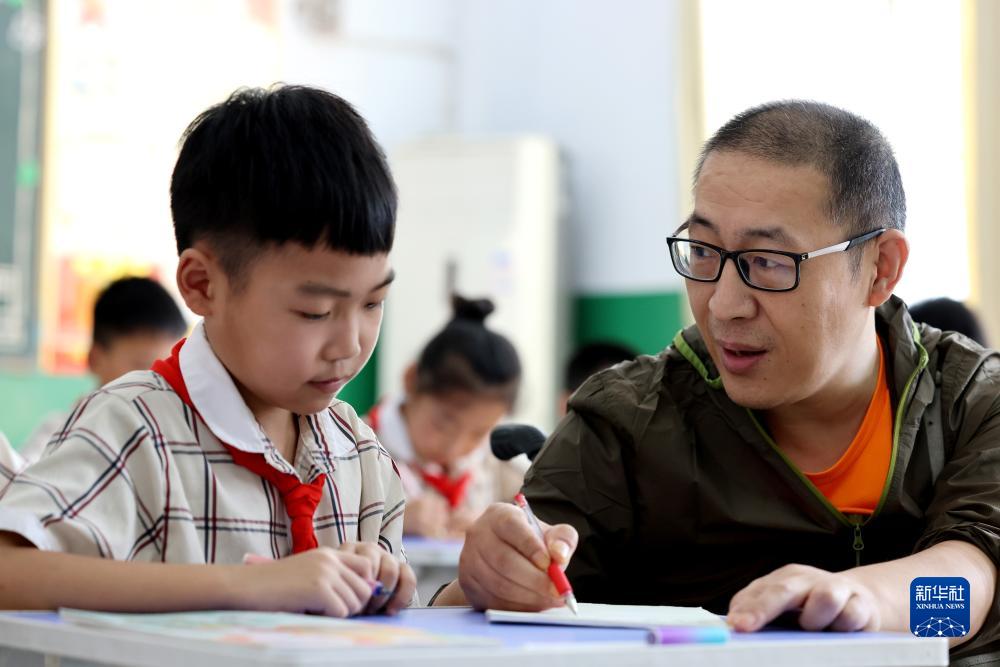 9月5日,在山東省棗莊市永安鎮(zhèn)遺棠小學,楊季剛在輔導四年級學生英語。