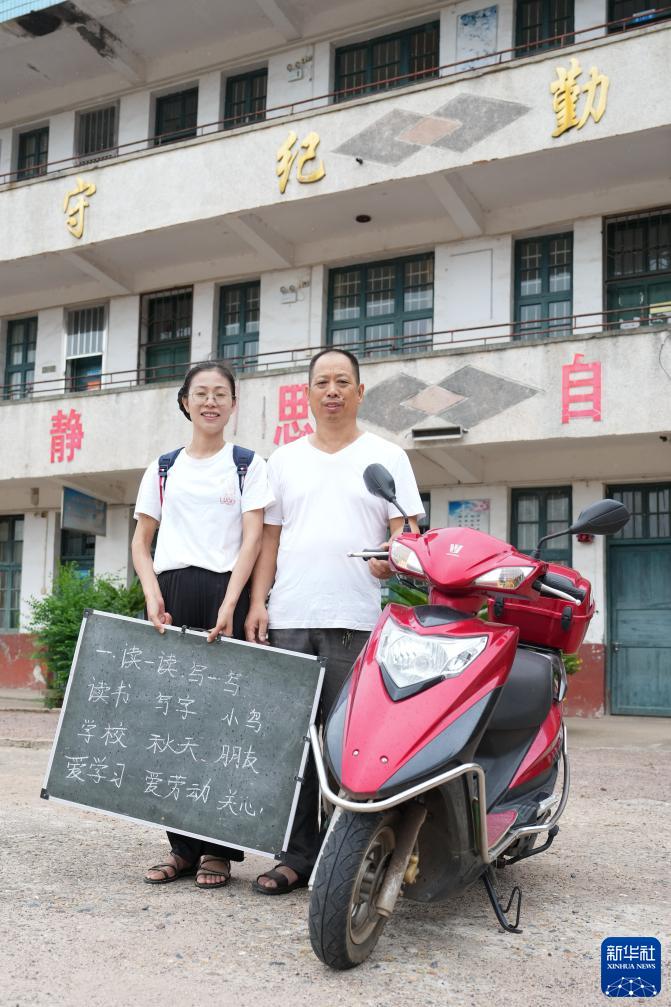 9月7日,陳艷輝(左)和父親陳二文拿著上門送教時使用的小黑板在湖南省株洲市界首中心小學白洲教學點留影。