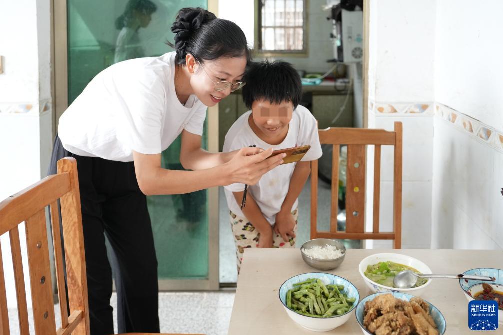 9月7日,陳艷輝(左)在湖南省株洲市茶陵縣界首鎮(zhèn)大新村的小美家中和小美一起拍下做好的午飯。新華社記者 薛宇舸 攝