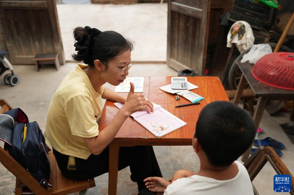 9月6日,陳艷輝在湖南省株洲市茶陵縣界首鎮花甲村的小宇家中教小宇秋季安全常識。新華社記者 薛宇舸 攝