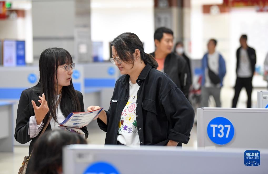 9月9日,求職者(左)在招聘會(huì)現(xiàn)場(chǎng)與用人單位工作人員交流。