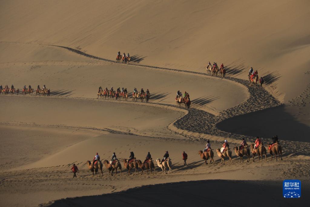 9月9日,游客在甘肅省敦煌市鳴沙山月牙泉景區游覽。