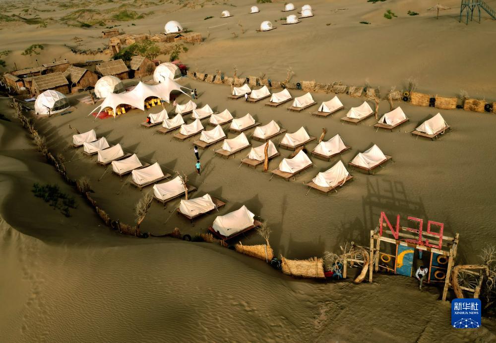 這是新疆喀什地區(qū)麥蓋提縣N39°沙漠旅游景區(qū)內(nèi)的營地(9月7日攝,無人機照片)。