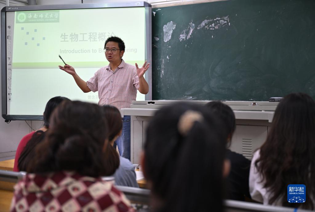 9月7日,曾念開(右)在海南師范大學(xué)給學(xué)生上課。