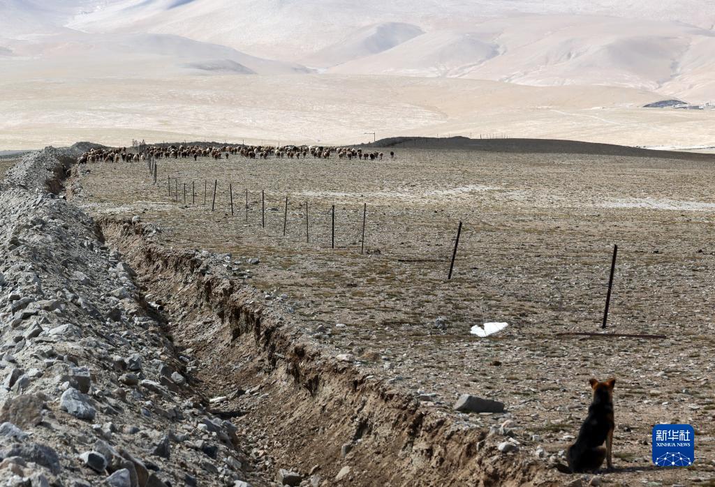 一只牧羊犬遠遠地看著羊群吃草(9月6日攝)。