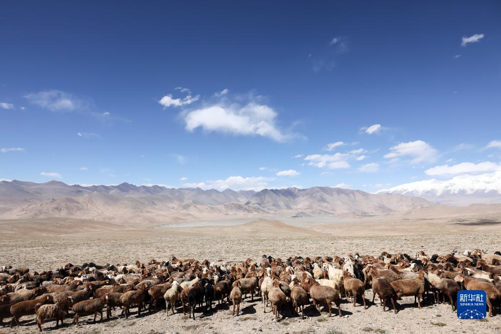 在“冰川之父”慕士塔格峰腳下,新疆塔什庫爾干塔吉克自治縣塔合曼鄉境內的一片天然草場吸引周邊鄉村的牧羊人在此放牧。進入秋季以來,草場漸漸泛黃,屹立于遠處的慕士塔格峰和公格爾九別峰在藍天白云的映襯下格外壯美,一幅寧靜悠遠的牧羊圖引人入勝。
