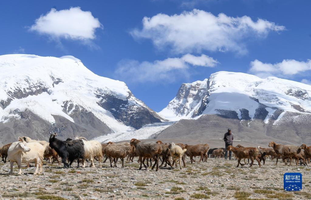 在“冰川之父”慕士塔格峰腳下,新疆塔什庫爾干塔吉克自治縣塔合曼鄉境內的一片天然草場吸引周邊鄉村的牧羊人在此放牧。進入秋季以來,草場漸漸泛黃,屹立于遠處的慕士塔格峰和公格爾九別峰在藍天白云的映襯下格外壯美,一幅寧靜悠遠的牧羊圖引人入勝。