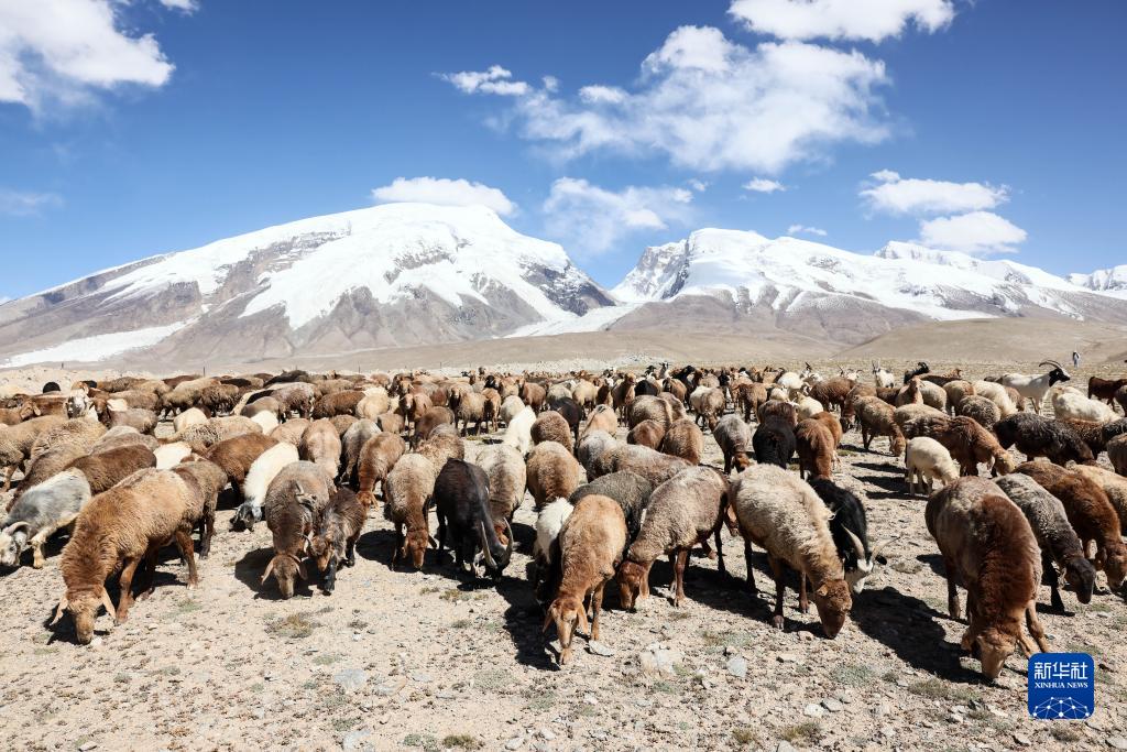在“冰川之父”慕士塔格峰腳下,新疆塔什庫爾干塔吉克自治縣塔合曼鄉境內的一片天然草場吸引周邊鄉村的牧羊人在此放牧。進入秋季以來,草場漸漸泛黃,屹立于遠處的慕士塔格峰和公格爾九別峰在藍天白云的映襯下格外壯美,一幅寧靜悠遠的牧羊圖引人入勝。