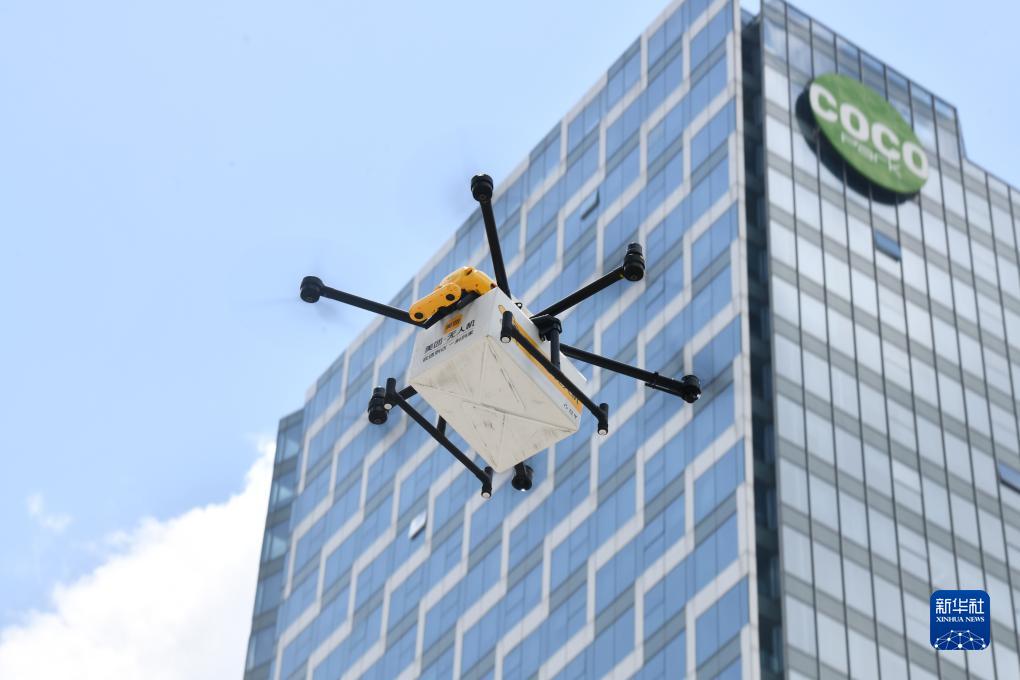在深圳市龍崗區,一架送餐無人機穿行在高樓大廈間(8月15日攝)。