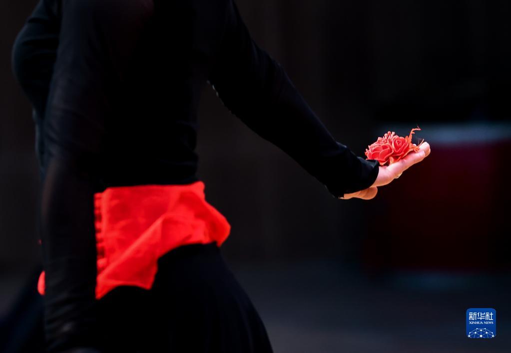 新疆塔縣文工團(tuán)舞蹈演員古麗巴努爾·庫爾恰克在排練《花兒為什么這樣紅》(9月4日攝)。