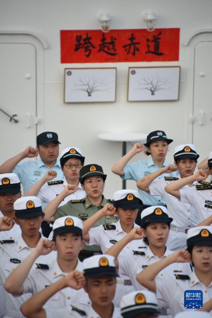 中國海軍“和平方舟”號醫院船跨越赤道時,文職人員和軍人一起參加宣誓儀式(7月22日攝)。