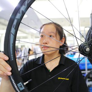 9月9日,在山東樂陵市一家企業(yè)的碳纖維自行車生產(chǎn)車間,工人在檢驗輪組。