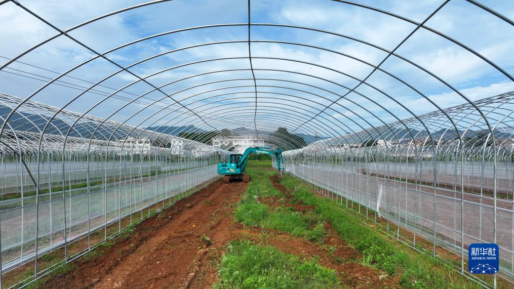 9月9日,工人在常寧市洋泉鎮巷坪村智慧育苗大棚施工現場施工。