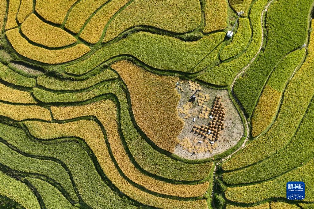 9月9日,農(nóng)民在貴州省黔南布依族苗族自治州貴定縣沿山鎮(zhèn)臘利梯田收割水稻。