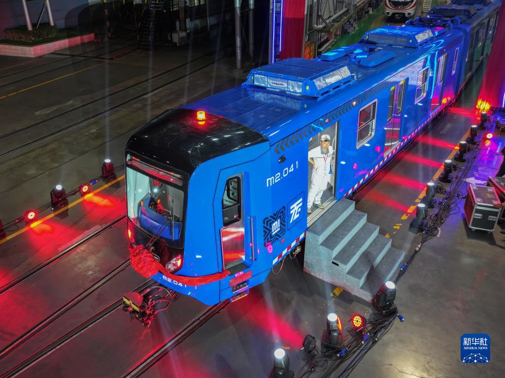 這是在中車株機(jī)公司拍攝的中國中車出口墨西哥城輕軌列車首列車(9月10日攝,無人機(jī)照片)。