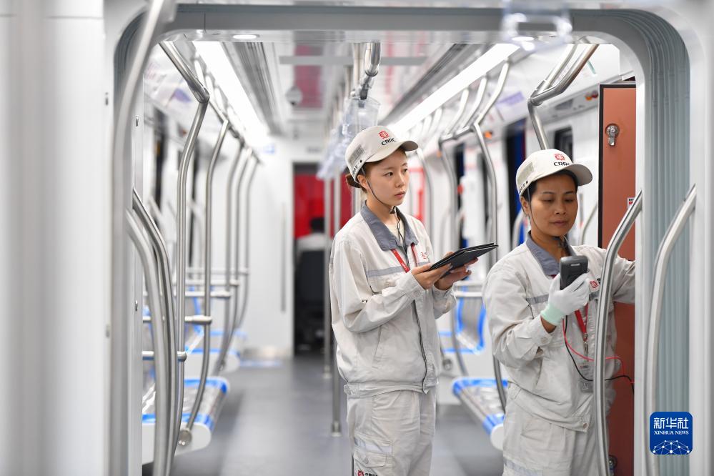 中車株機公司工作人員在中國中車出口墨西哥城輕軌列車首列車內巡檢(9月9日攝)。