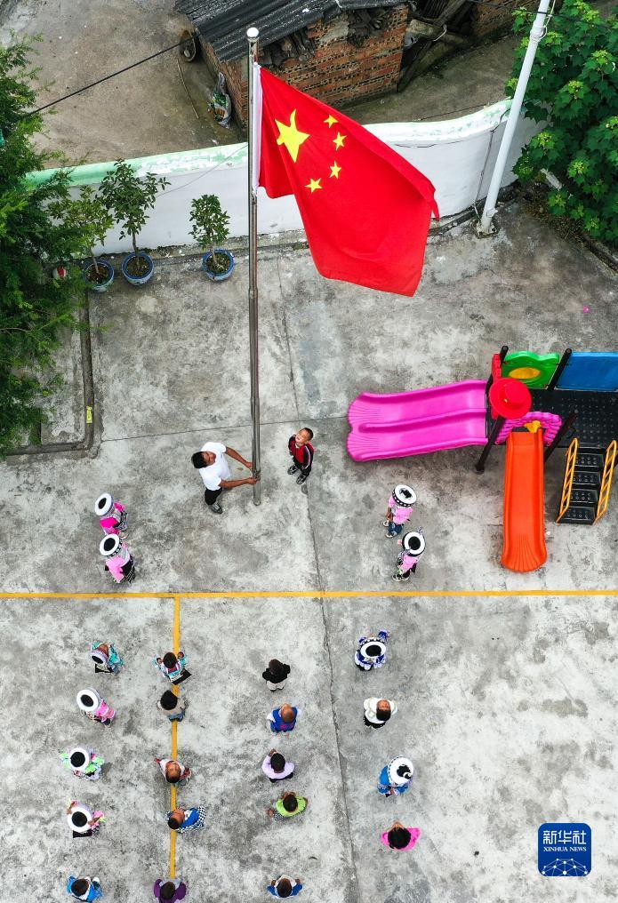 陸成文與學(xué)生在教學(xué)點(diǎn)升旗(9月7日攝,無人機(jī)照片)。