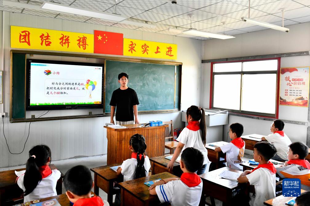 9月5日,在微山縣高樓鄉(xiāng)渭河小學,金子照老師在上課。