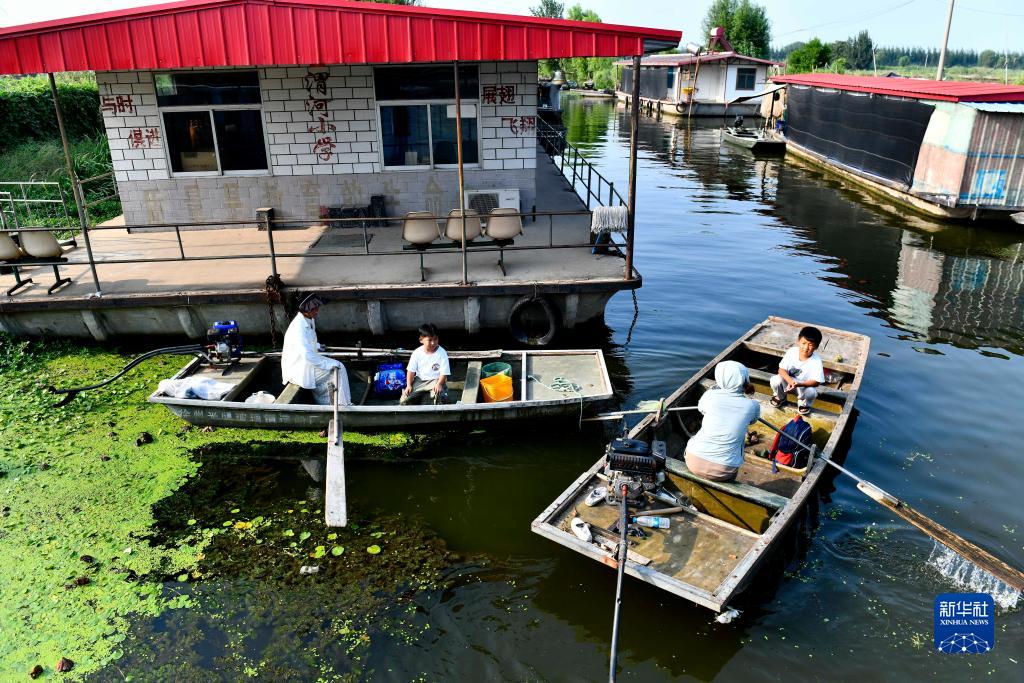 9月5日,在微山縣高樓鄉(xiāng)渭河小學(xué),放學(xué)后家長劃船接孩子回家。