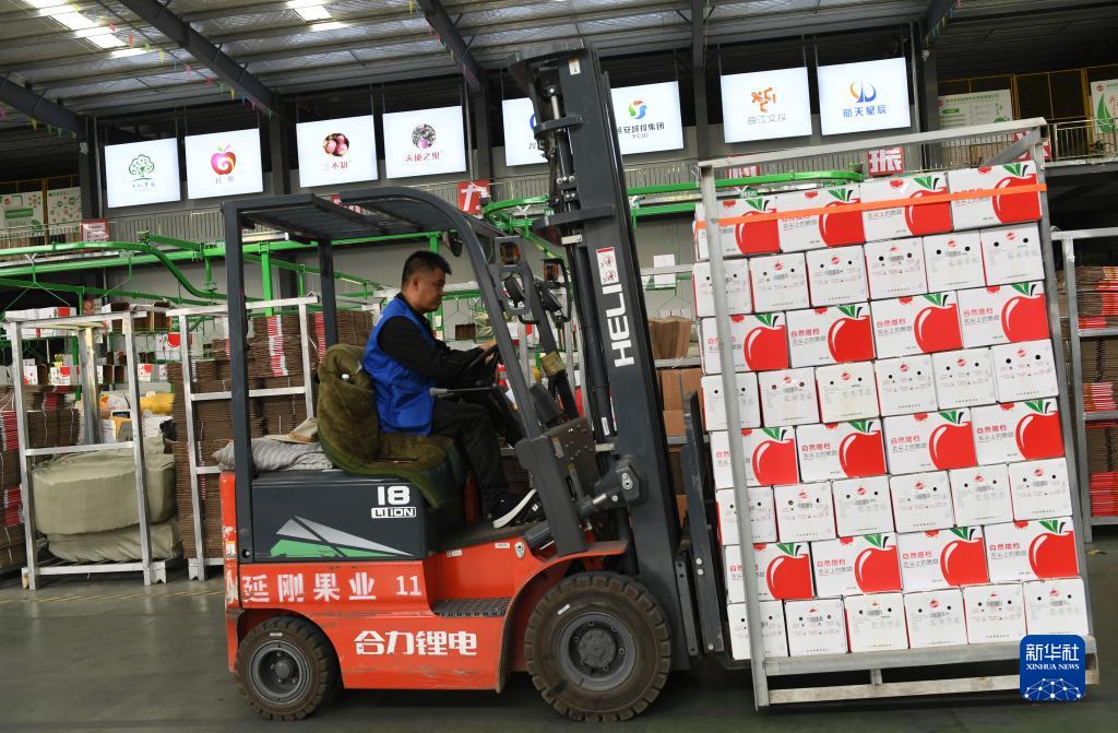 9月10日,在洛川蘋果現代產業園,工作人員準備將裝箱后的蘋果運輸上車。