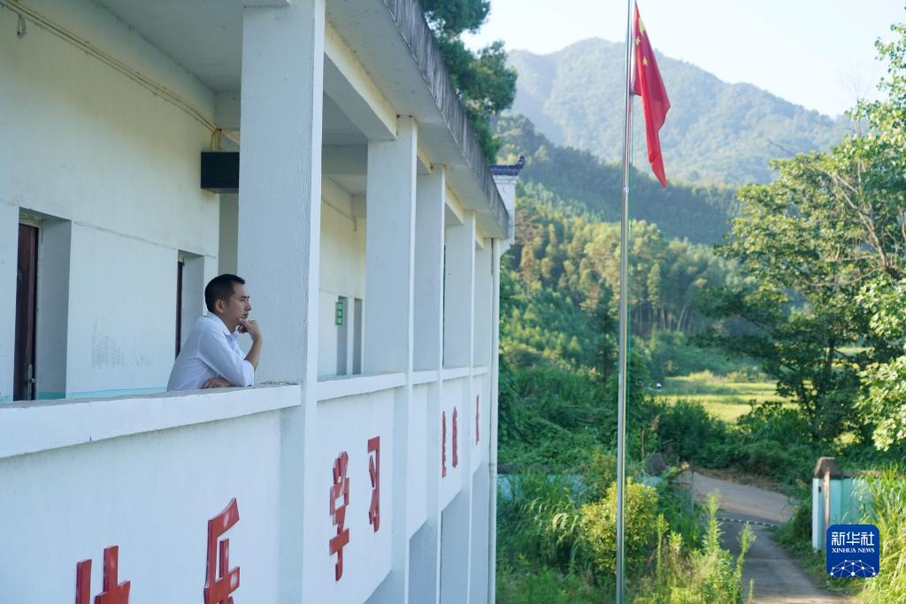 在江西省高安市華林山鎮(zhèn)中心小學(xué)朱家教學(xué)點(diǎn),李新江望著空空的校園和遠(yuǎn)山(9月4日攝)。