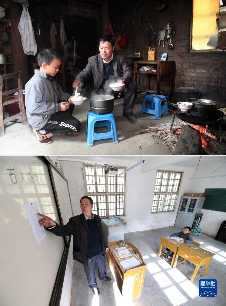 拼版照片:劉顯岳老師在廣西環(huán)江毛南族自治縣龍巖鄉(xiāng)朝閣村的家里給學(xué)生周雄打飯(上圖),朝閣小學(xué)的劉顯岳老師給學(xué)生周雄上課(下圖)(2019年12月4日攝)。朝閣小學(xué)曾經(jīng)有百余名學(xué)生,到2019年12月只剩下時(shí)年58歲的老師劉顯岳和學(xué)生周雄,成了一所“一師一生”的學(xué)校,周雄每周星期一到星期五住在學(xué)校,其間學(xué)習(xí)生活由劉顯岳老師照顧。