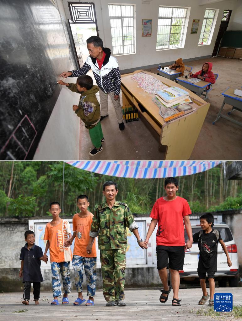拼版照片:廣西上思縣那琴鄉(xiāng)中心小學(xué)逢通村教學(xué)點(diǎn)的梁志雄老師給學(xué)生上課(上圖,2019年11月19日攝),梁志雄老師和學(xué)生課后走在校園里(下圖,2021年6月16日攝)。梁志雄老師2005年被調(diào)到那琴鄉(xiāng)中心小學(xué)逢通村教學(xué)點(diǎn),這里到2017年僅剩梁志雄和三名殘障學(xué)生。2020年8月,梁志雄老師光榮退休。但三名殘障學(xué)生無(wú)法升學(xué)到其他學(xué)校就讀,梁志雄接受返聘繼續(xù)留守。2021年2月,逢通村教學(xué)點(diǎn)又來(lái)兩名殘障學(xué)生,這個(gè)教學(xué)點(diǎn)成了梁志雄老師和5個(gè)殘障學(xué)生“一師五生”的學(xué)校。